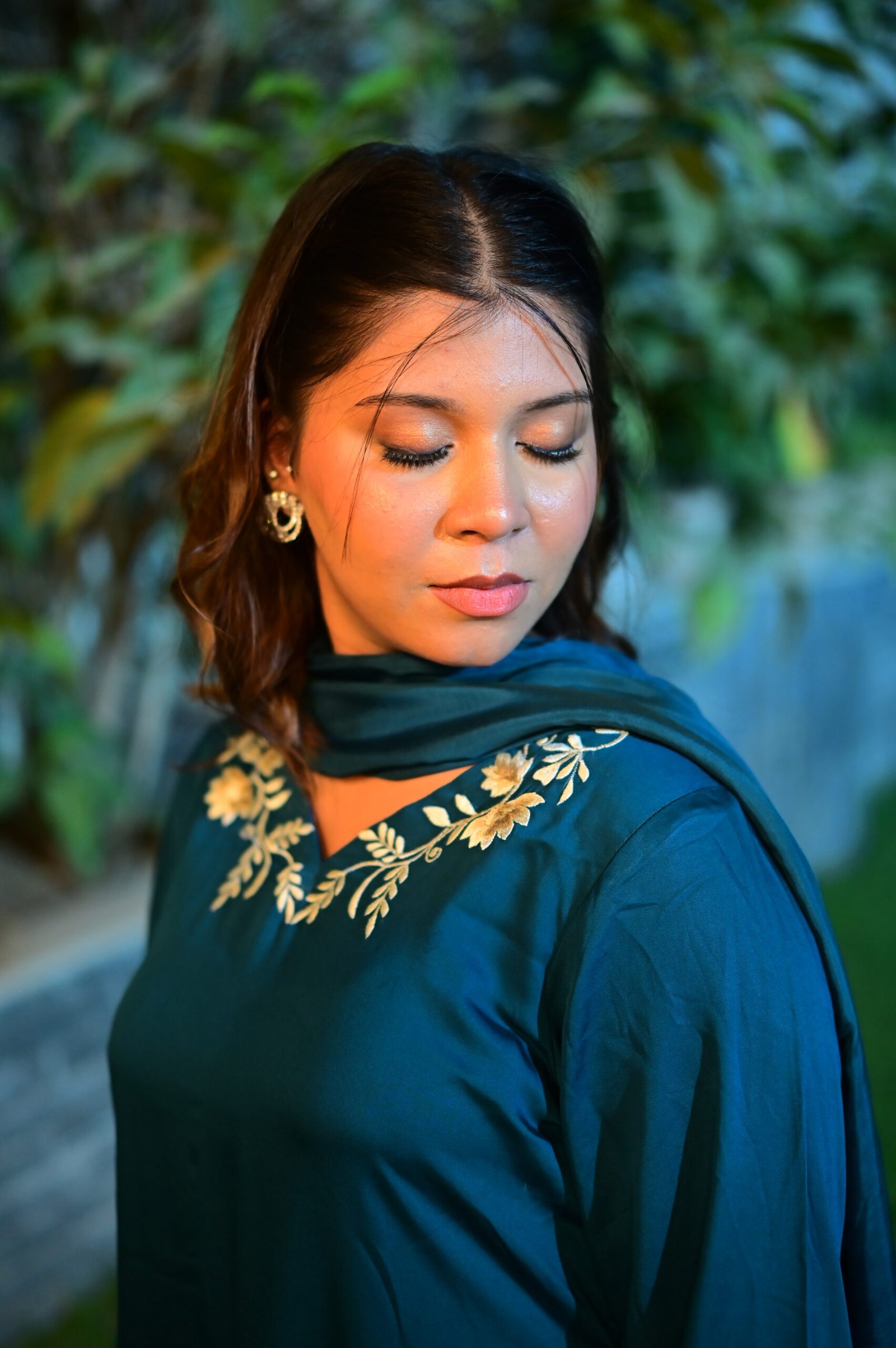 3-piece zinc-blue outfit made on stone silk. white embroidery detailing on the neckline, sleeves, and borders.