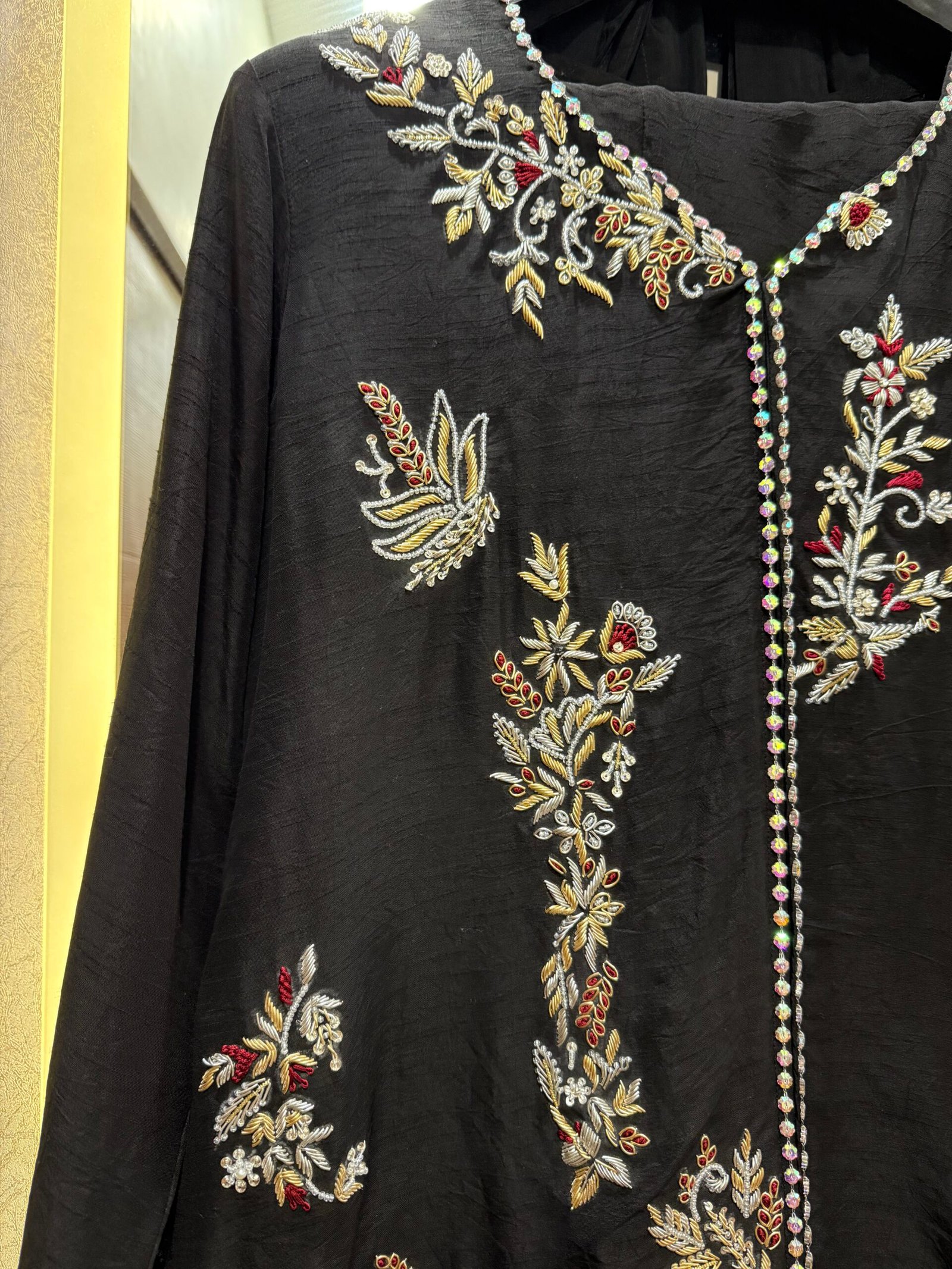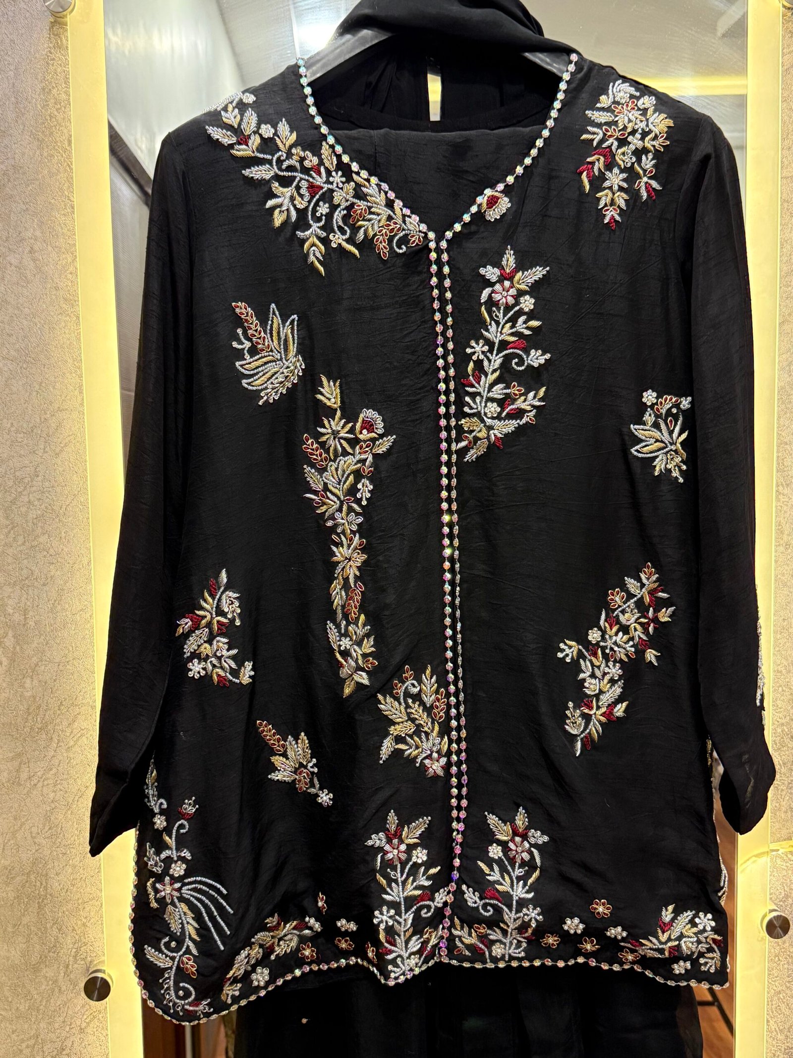 Ideal for Eid festivities, formal occasions, evening wear, and luxury gatherings, this ensemble combines premium fabrics, traditional hand embellishment, and contemporary tailoring.