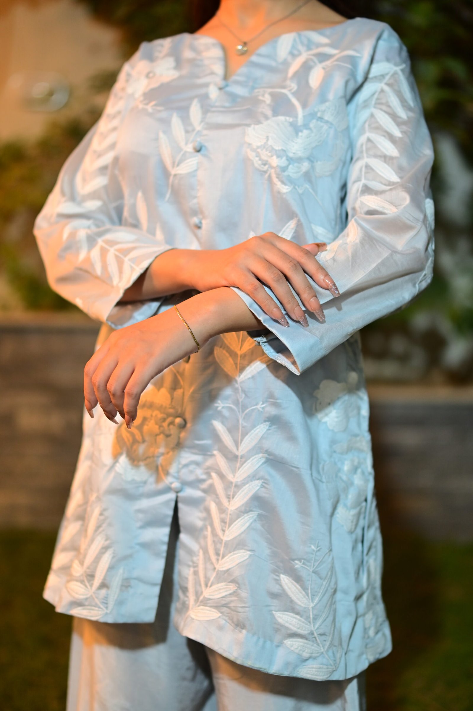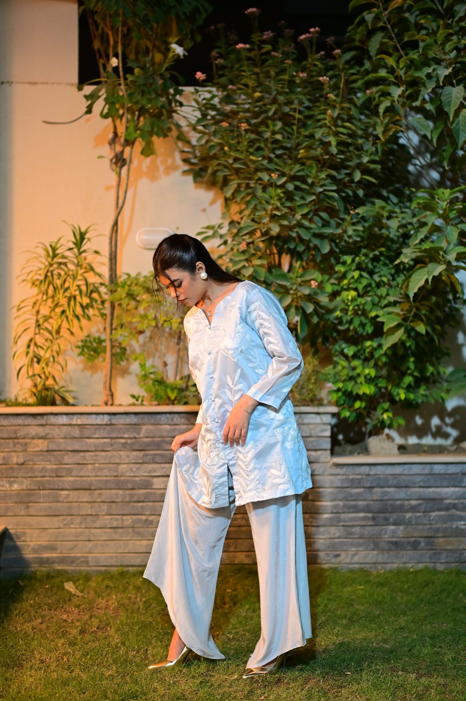 An icy blue paper cotton ensemble featuring delicate embroidery, a front-slit shirt, and flowy skirt pants – where elegance meets effortless calm