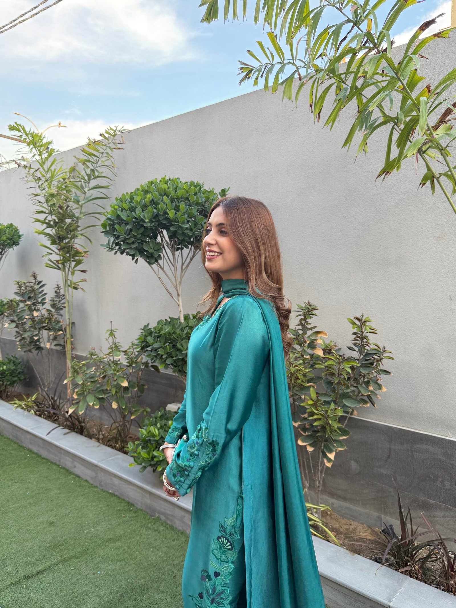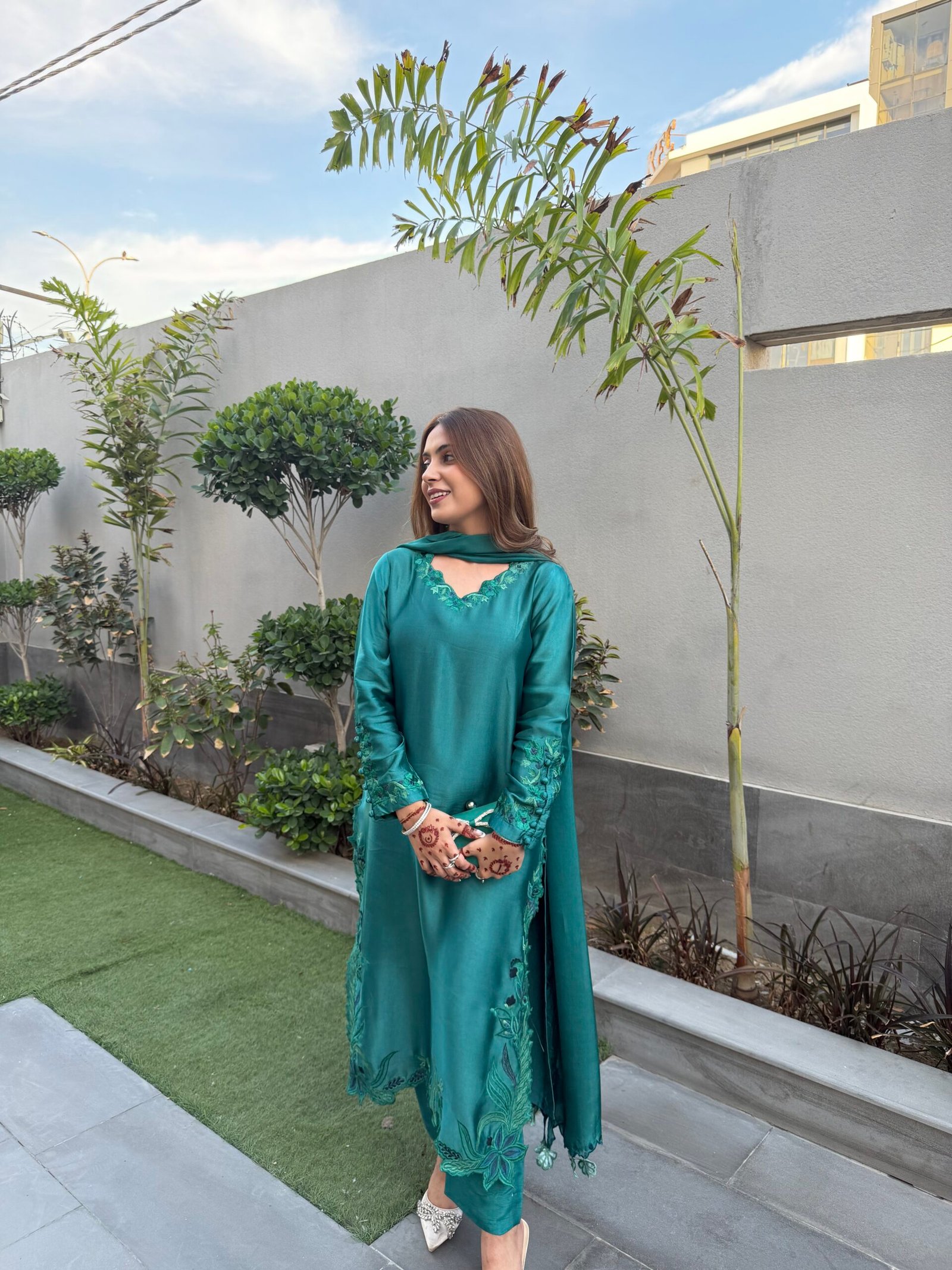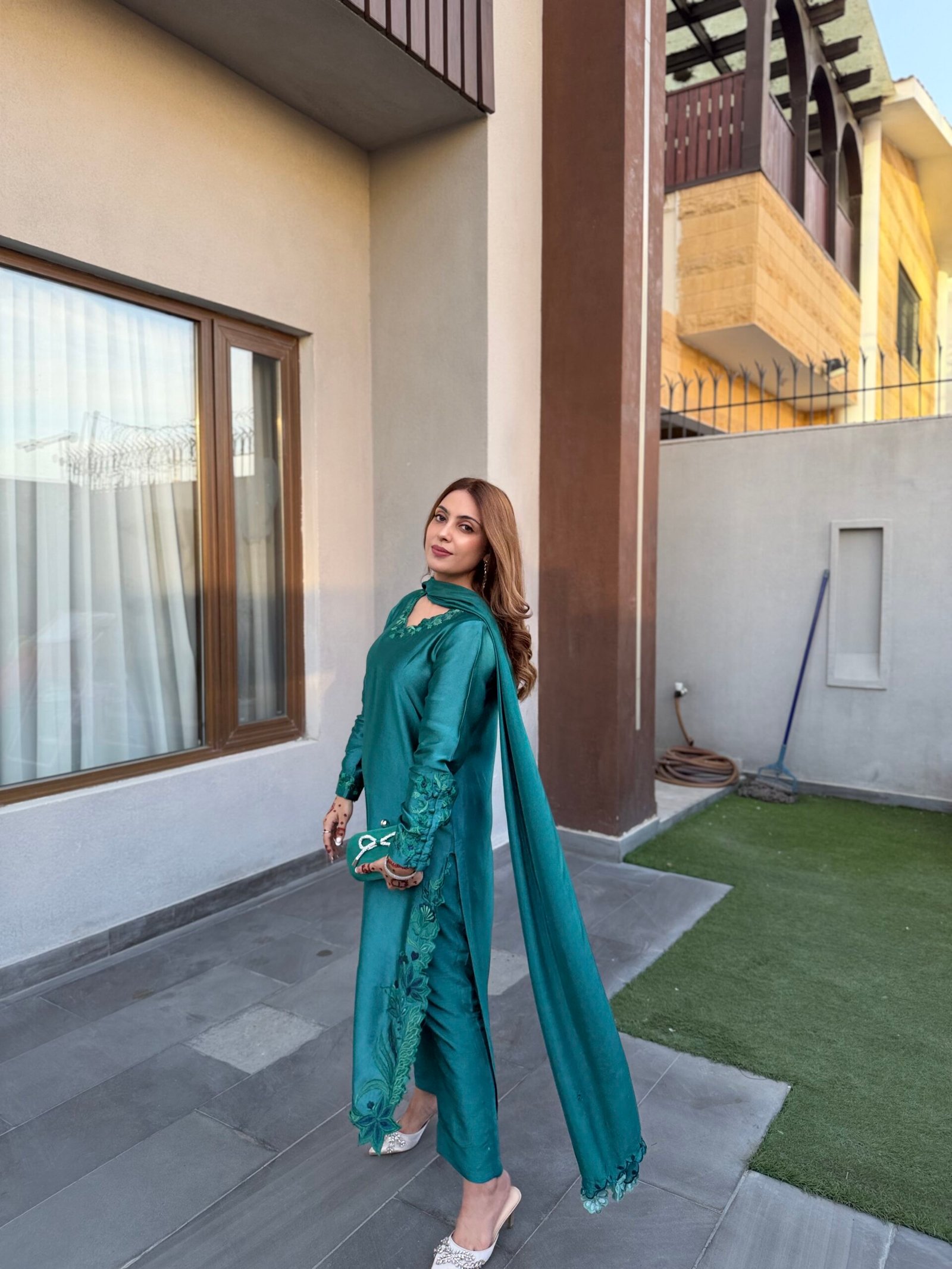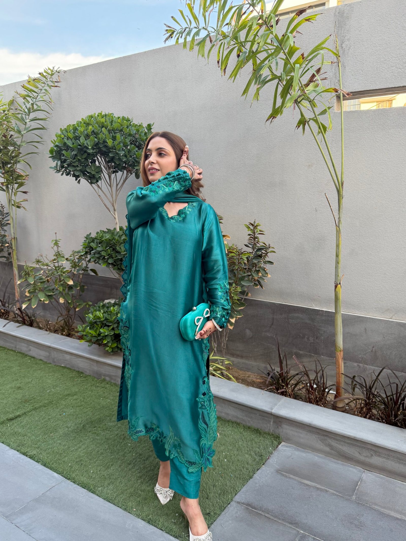 A refined teal ensemble crafted from luxurious sheesha silk, featuring delicate embroidery that adds a subtle, elegant charm. The dupatta is beautifully finished with fancy scalloped edges and embroidered tassels, enhancing its graceful appeal. Paired with our signature raw silk pants, this outfit offers a perfect balance of sophistication and timeless style.