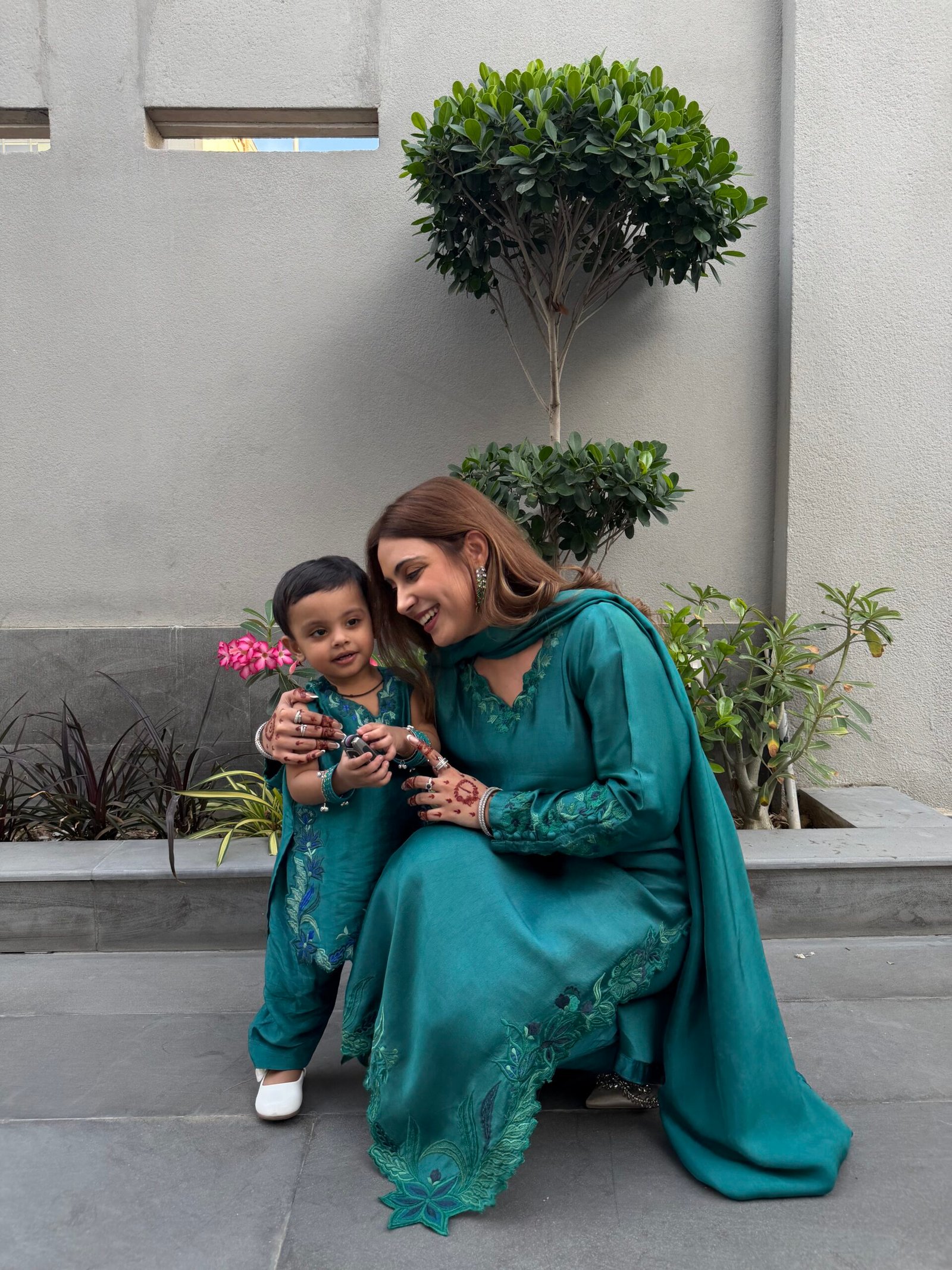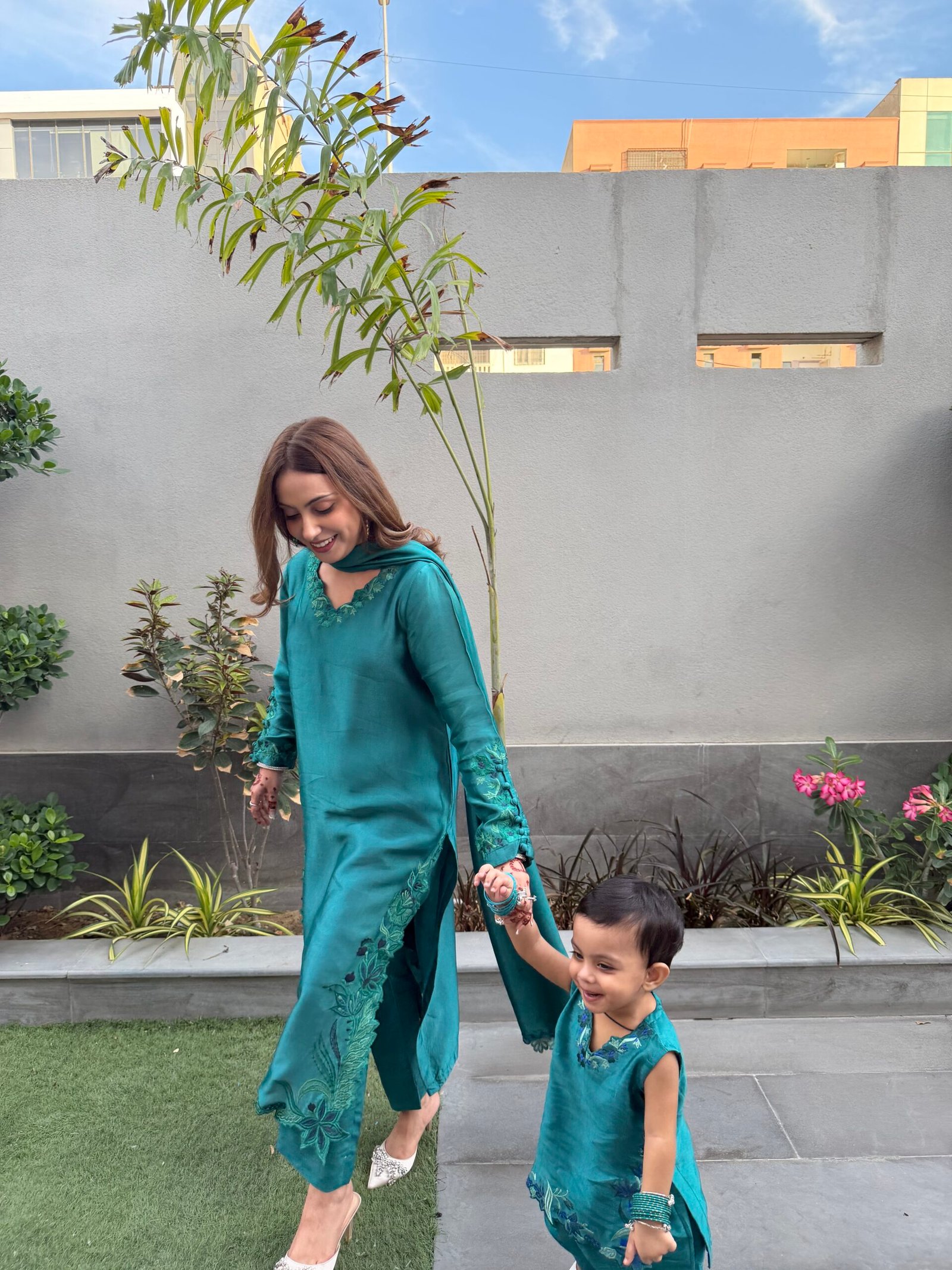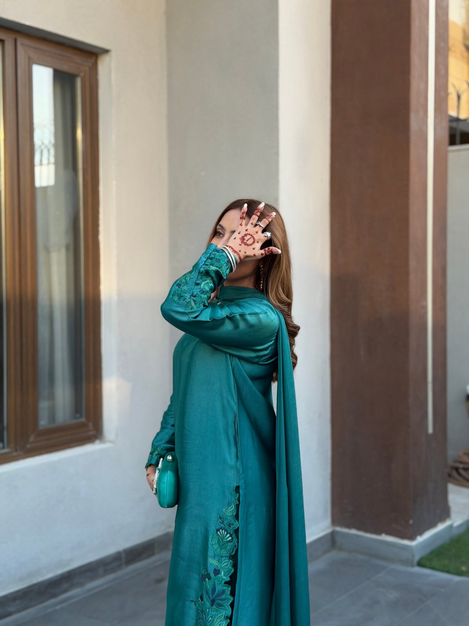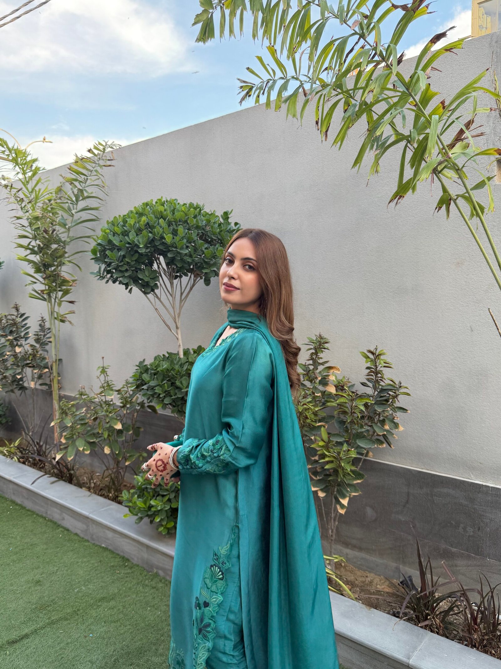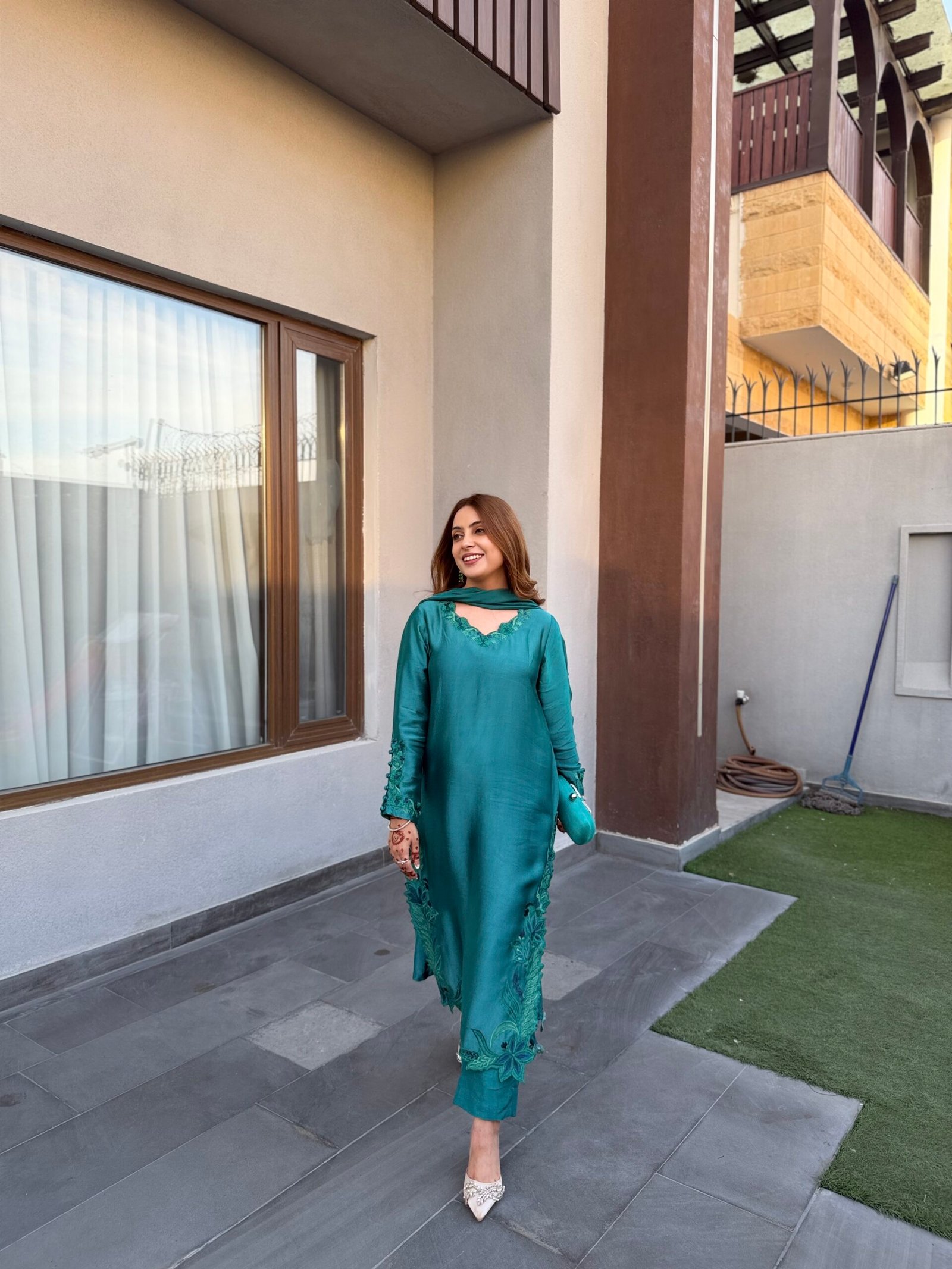 A refined teal ensemble crafted from luxurious sheesha silk, featuring delicate embroidery that adds a subtle, elegant charm. The dupatta is beautifully finished with fancy scalloped edges and embroidered tassels, enhancing its graceful appeal. Paired with our signature raw silk pants, this outfit offers a perfect balance of sophistication and timeless style.