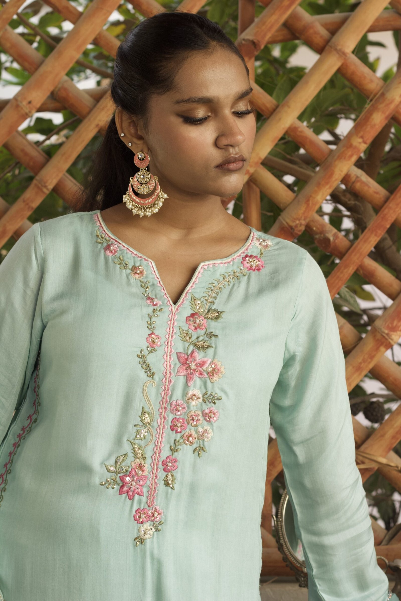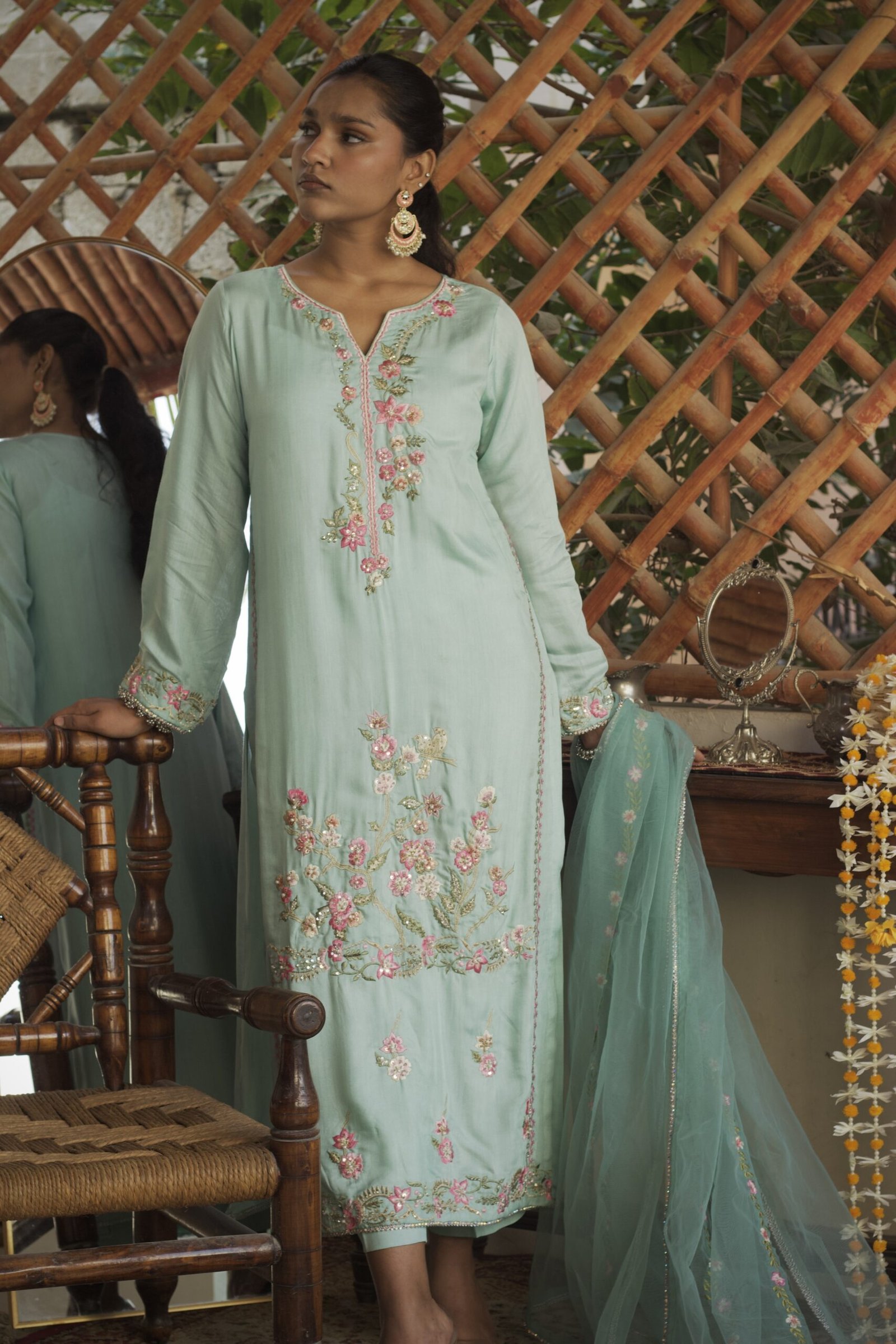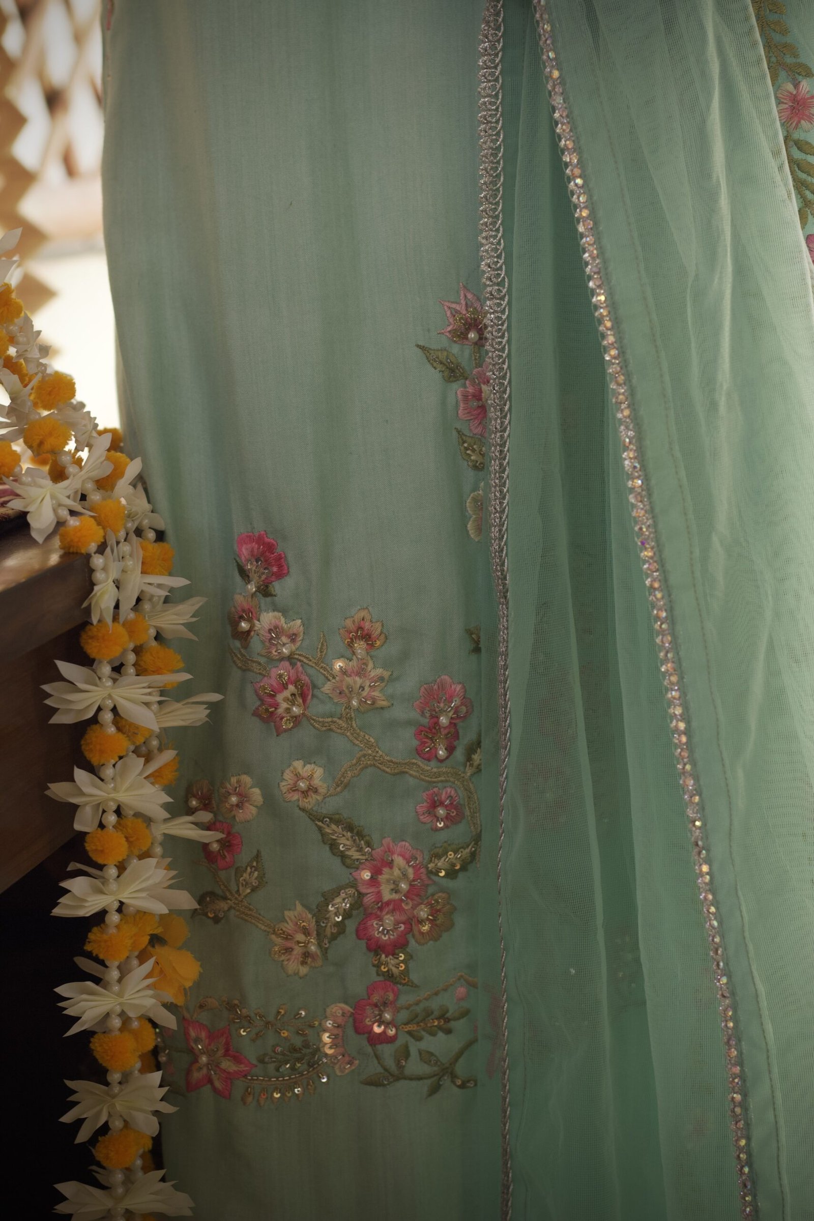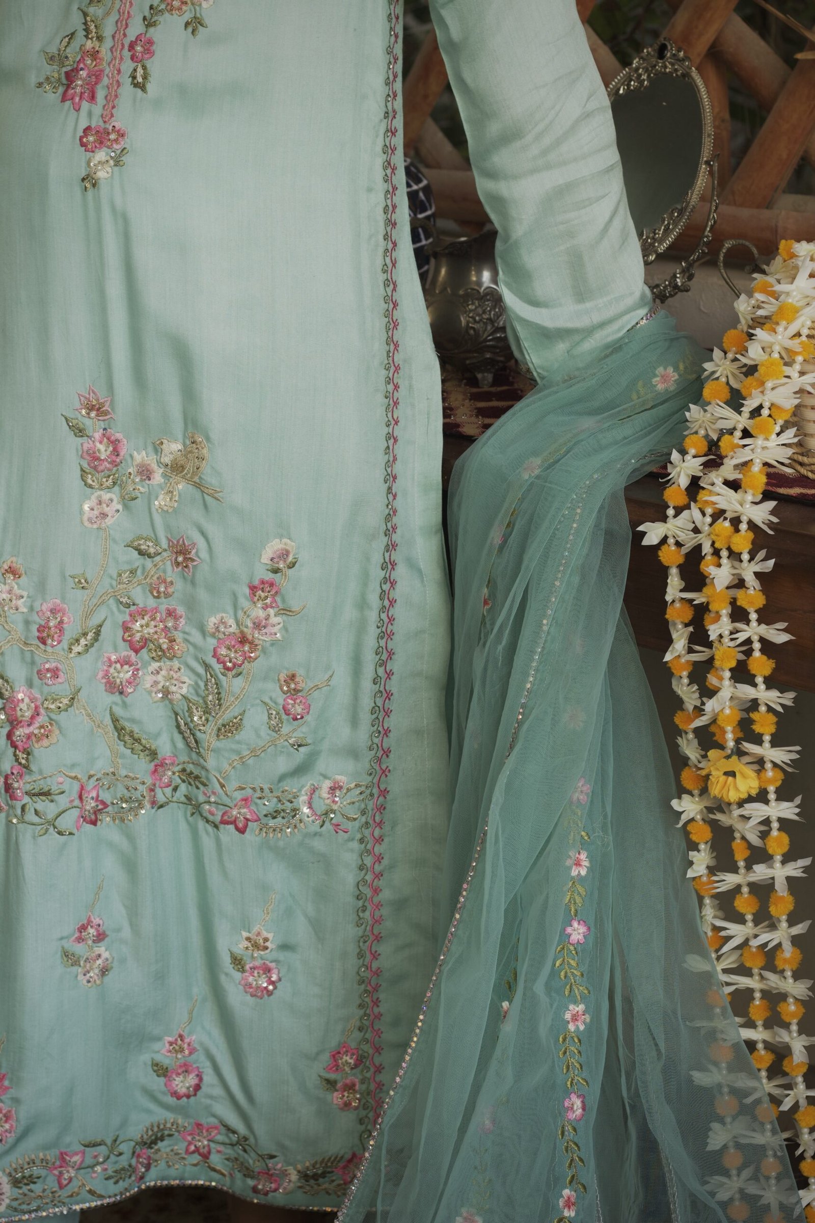 Gracefully designed in a refreshing sea green hue, this elegant ensemble is crafted from premium cotton silk fabric, offering a soft sheen and luxurious fall. The shirt is adorned with intricate heavy hand-touch embroidery, adding depth, texture, and a refined artisanal finish.