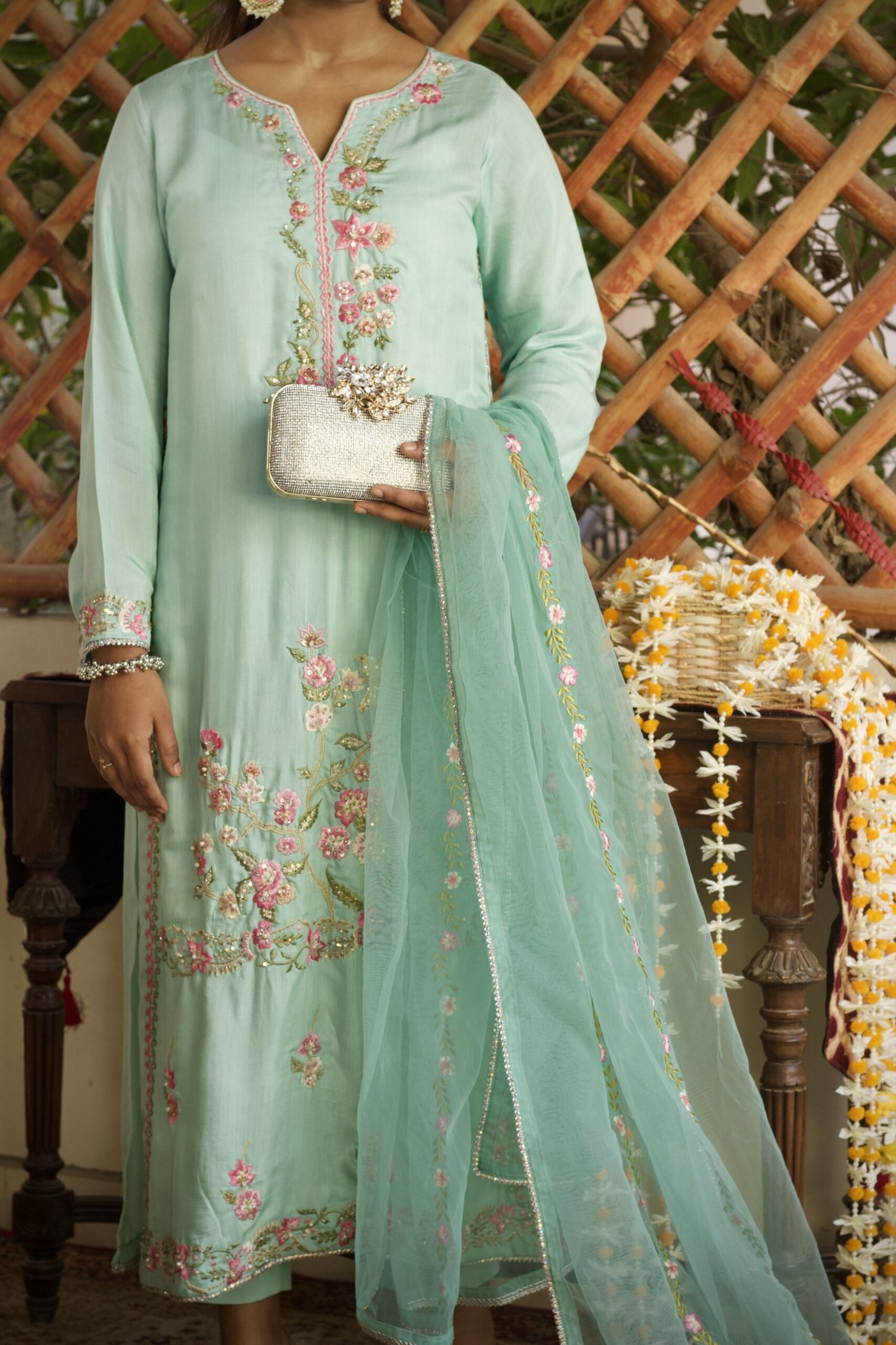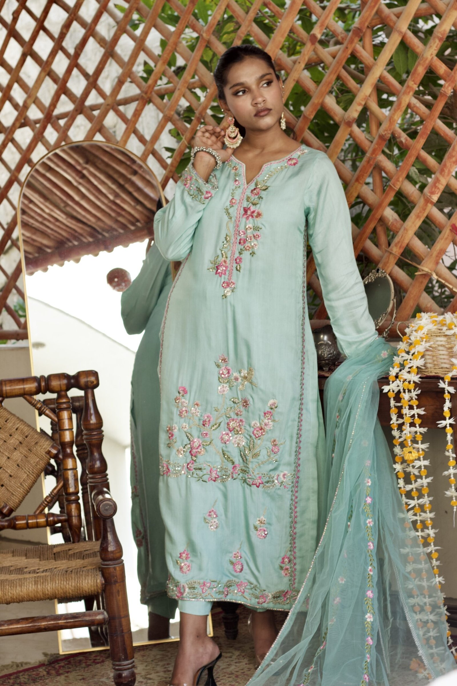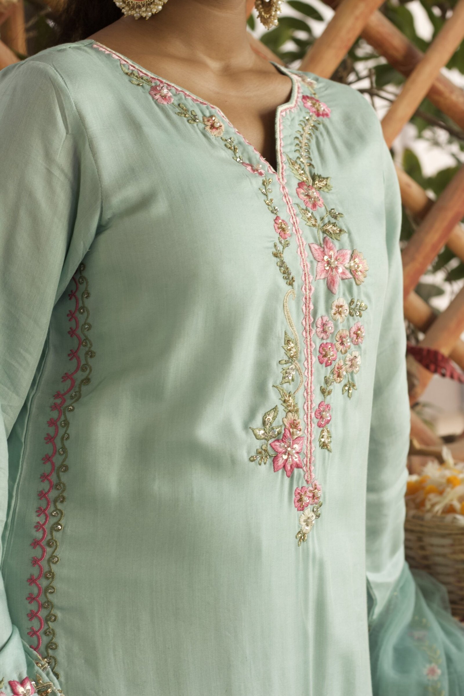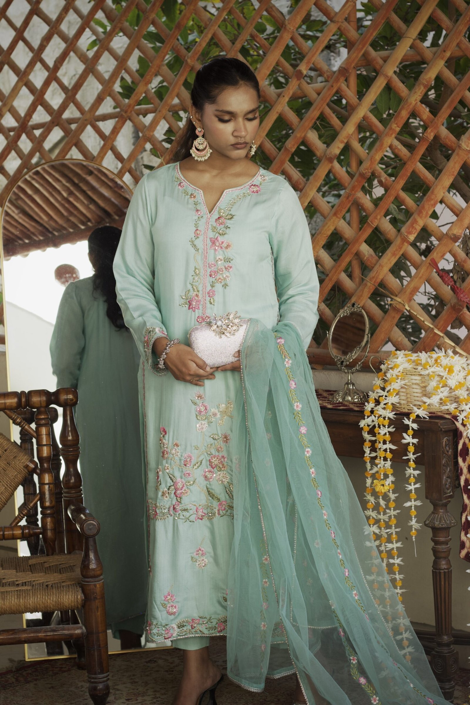 Gracefully designed in a refreshing sea green hue, this elegant ensemble is crafted from premium cotton silk fabric, offering a soft sheen and luxurious fall. The shirt is adorned with intricate heavy hand-touch embroidery, adding depth, texture, and a refined artisanal finish.