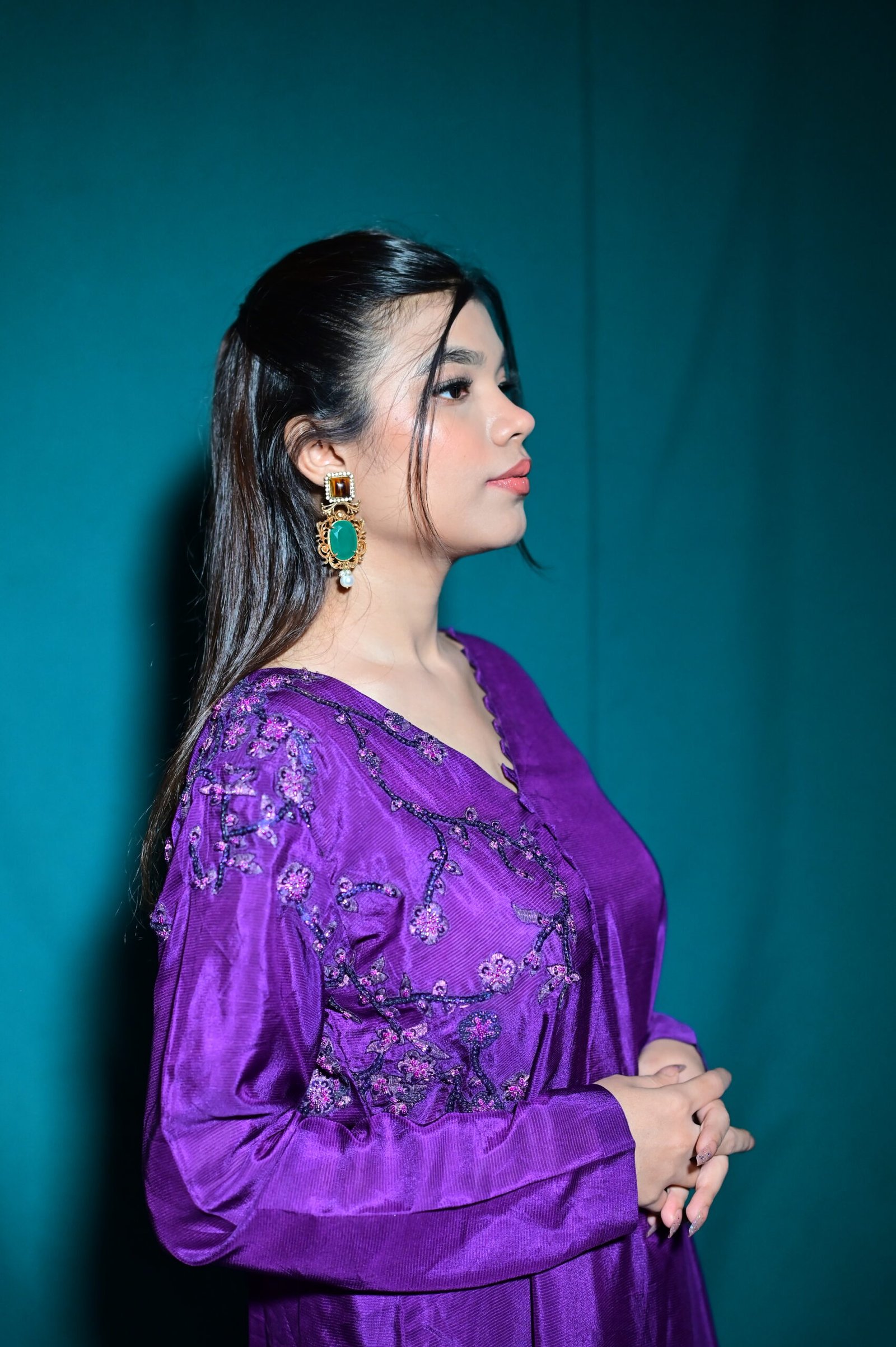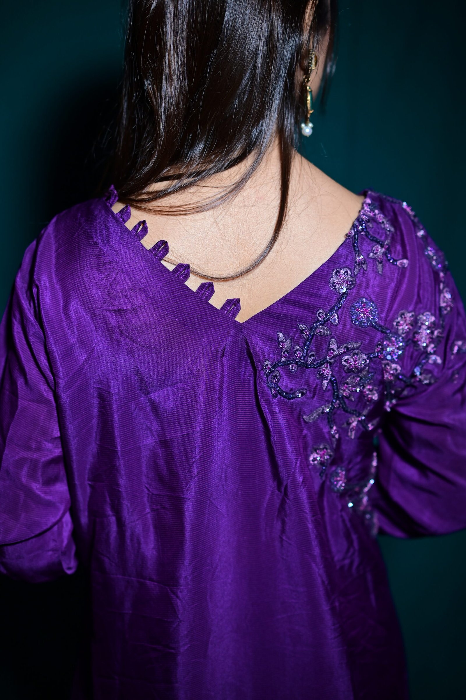 Violet exudes modern elegance with its rich crepe silk silhouette, designed in a long, flowy cut with soft asymmetrical draping. The scalloped neckline adds a refined touch, enhanced by subtle hand embellishments that highlight the deep purple tone. paired with straight trousers.